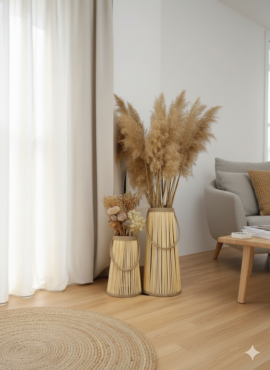 Bambu Çubuklu Ahşap Boncuklu Pampars Vazo 2'li Set(38Cm)