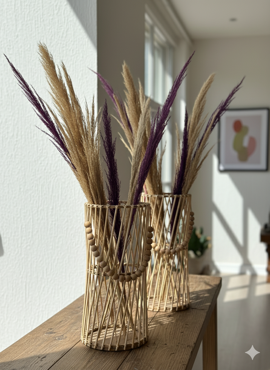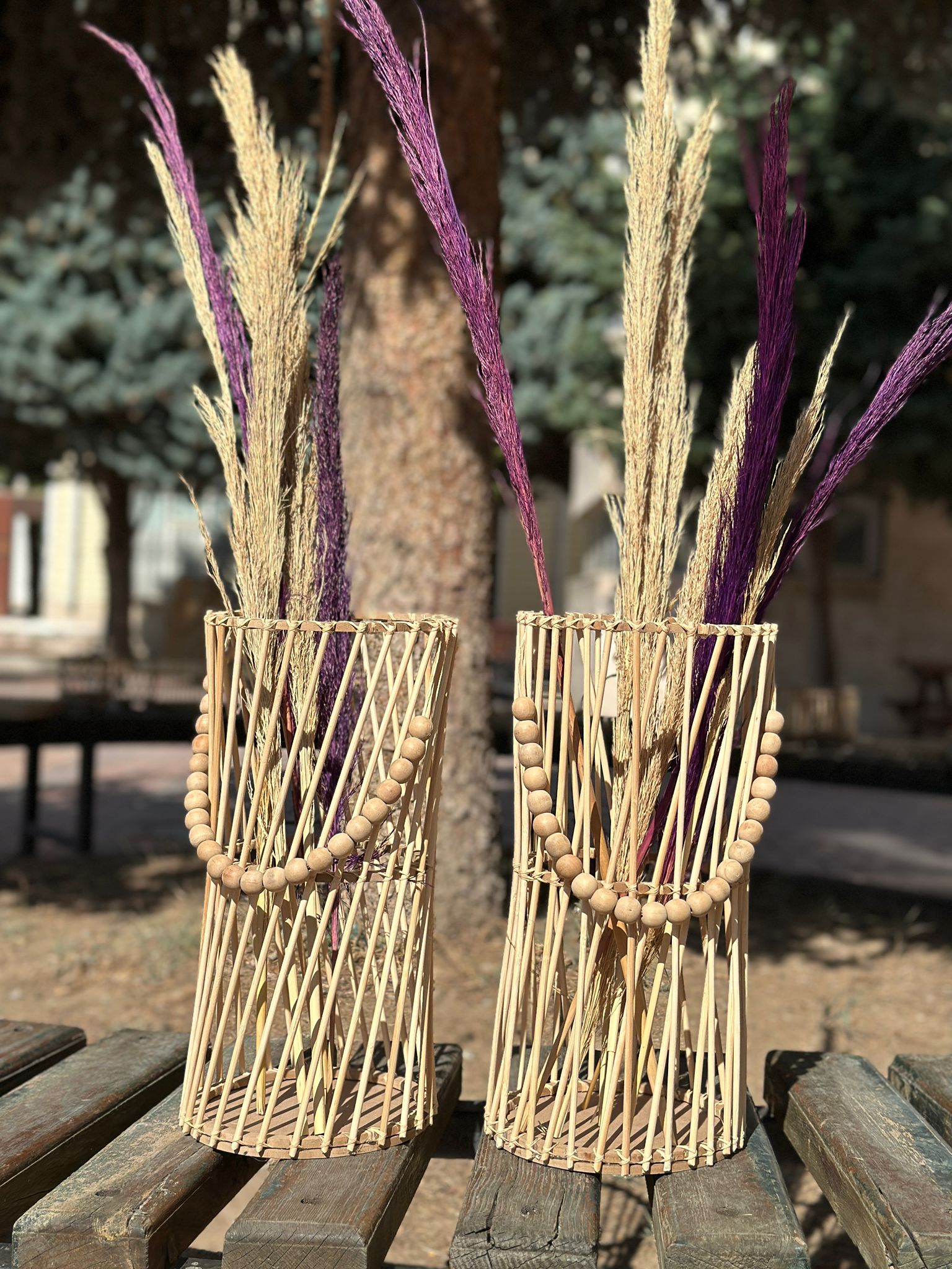 Bambu Çubuklu Ahşap Boncuklu Pampars Vazo 2'li Set