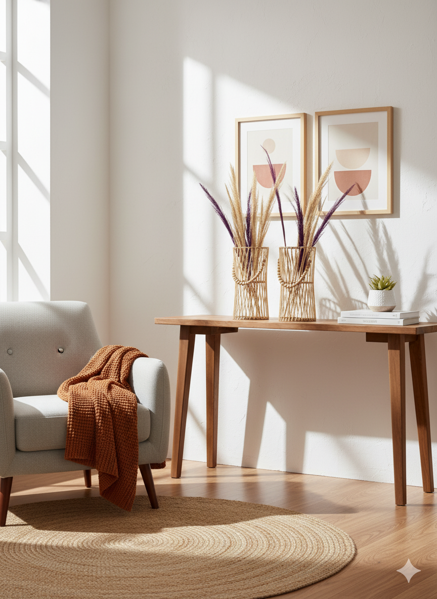 Dekorasyonda:, hasır objeler ve bitkilerle birlikte kullanılır. Katmanlı ve doğal dokulu ürünlerle sıcak bir atmosfer yaratılır.