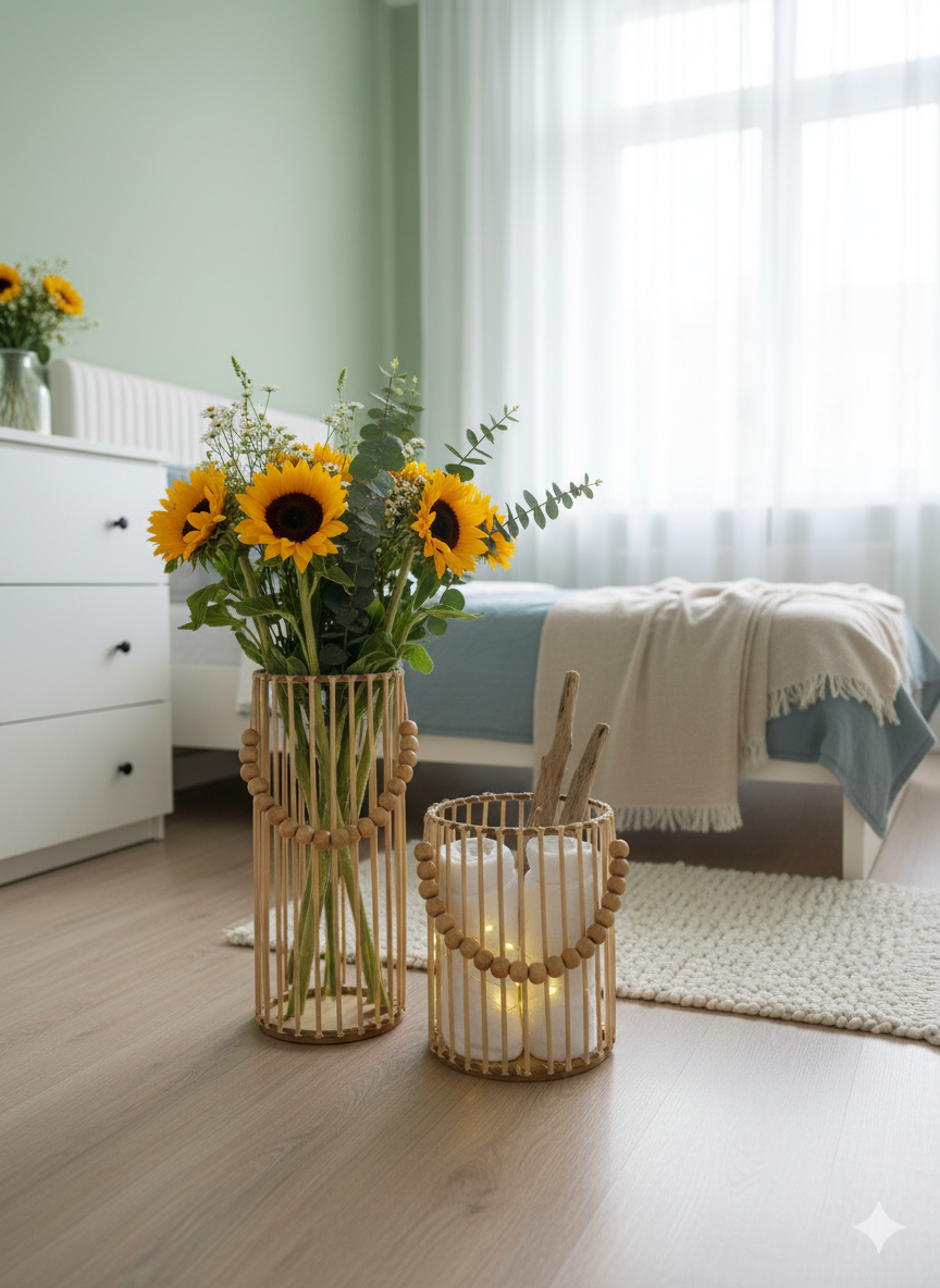 Dekorasyonda:, hasır objeler ve bitkilerle birlikte kullanılır. Katmanlı ve doğal dokulu ürünlerle sıcak bir atmosfer yaratılır.
