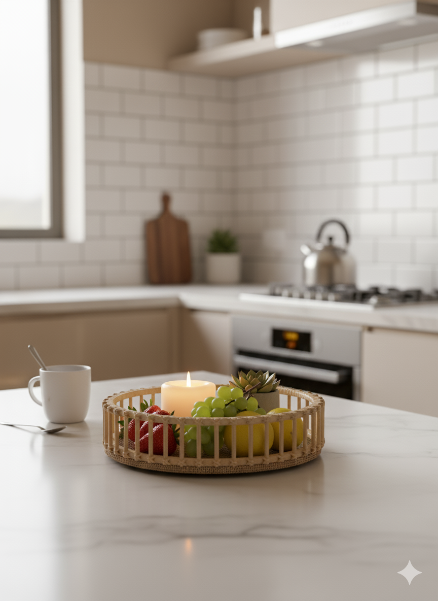Mutfağınızın Yıldızı: Tepsiyi tezgahınızın üzerine yerleştirin ve içine mevsimin en güzel meyvelerini (görseldeki gibi) koyun. Bu, mutfağınıza taze, davetkar ve doğal bir enerji katarak en basit meyve sunumunu bile şık bir hale getirir.
