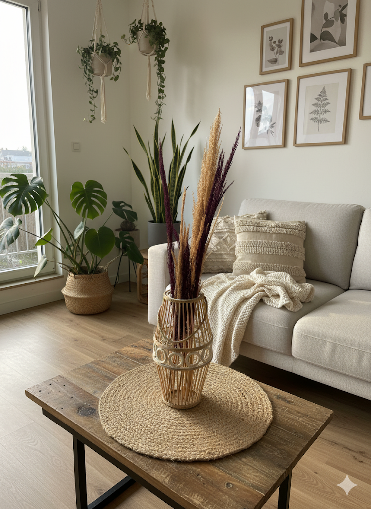 Dekorasyonda:, hasır objeler ve bitkilerle birlikte kullanılır. Katmanlı ve doğal dokulu ürünlerle sıcak bir atmosfer yaratılır.